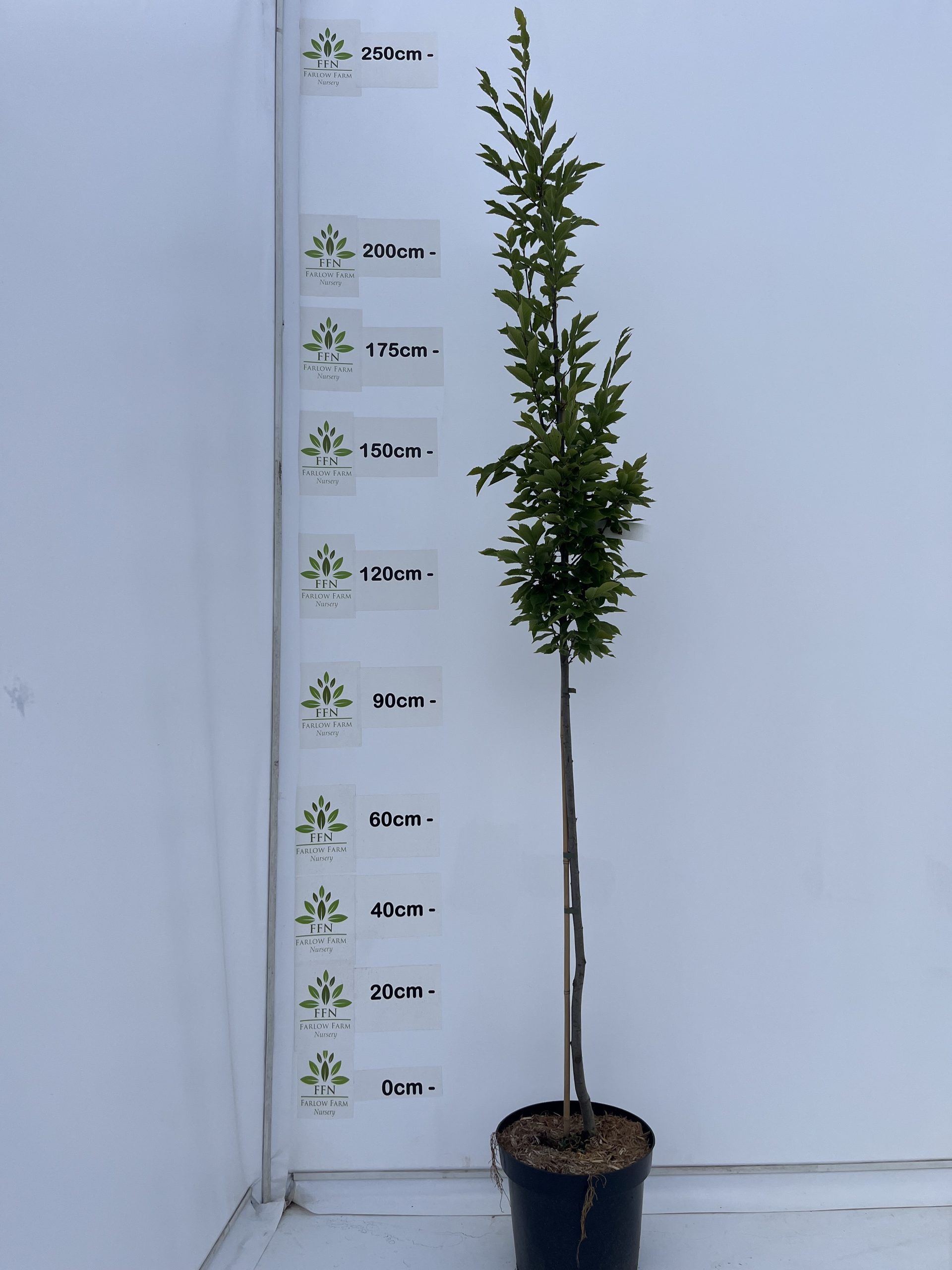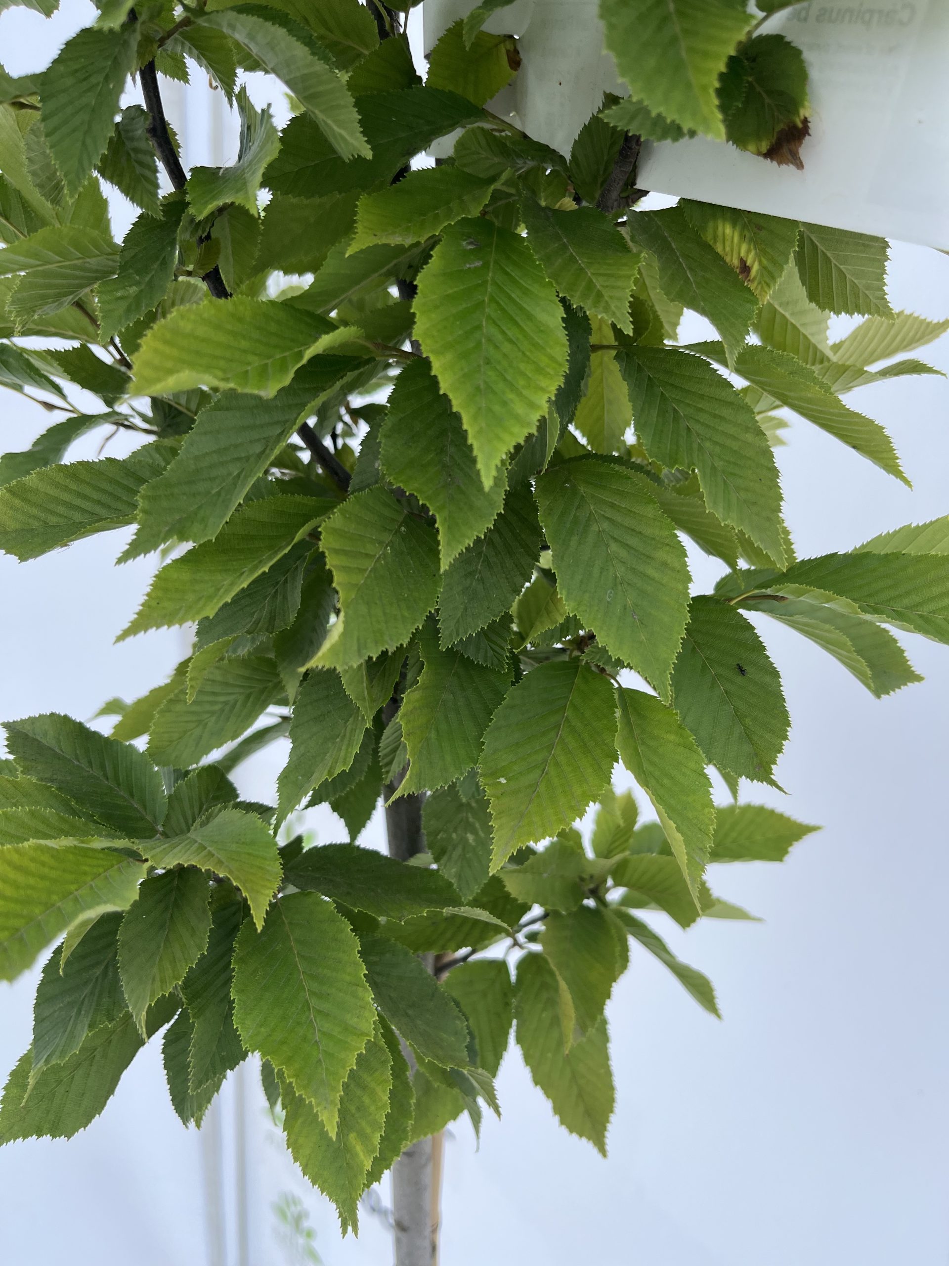 An upright deciduous tree, the crown narrow when young, becoming compact and ovoid. Bright green ribbed leaves are ovate, turning yellow in autumn. Fruiting catkins conspicuous, to 8cm in length. Good for woodland settings.