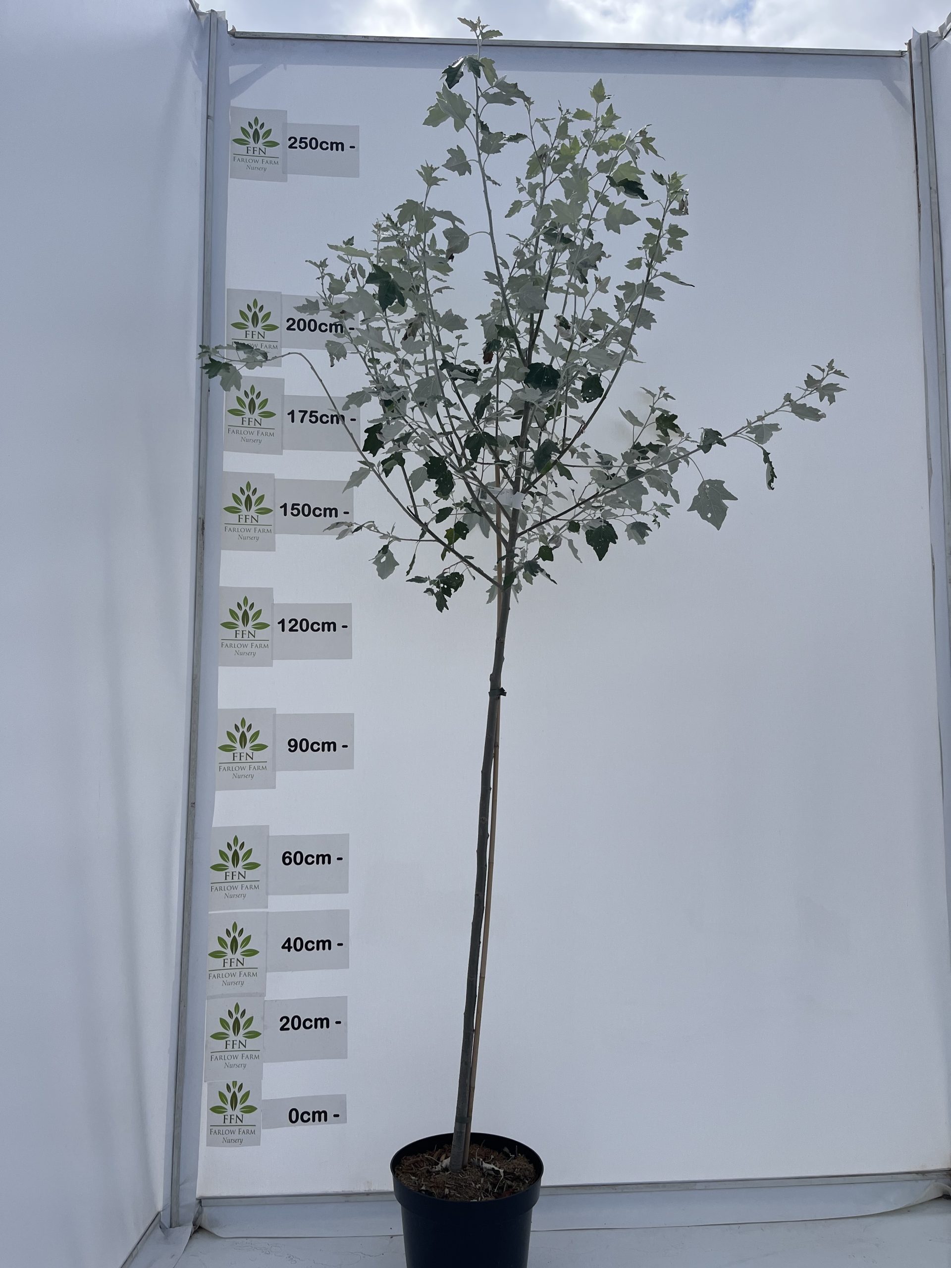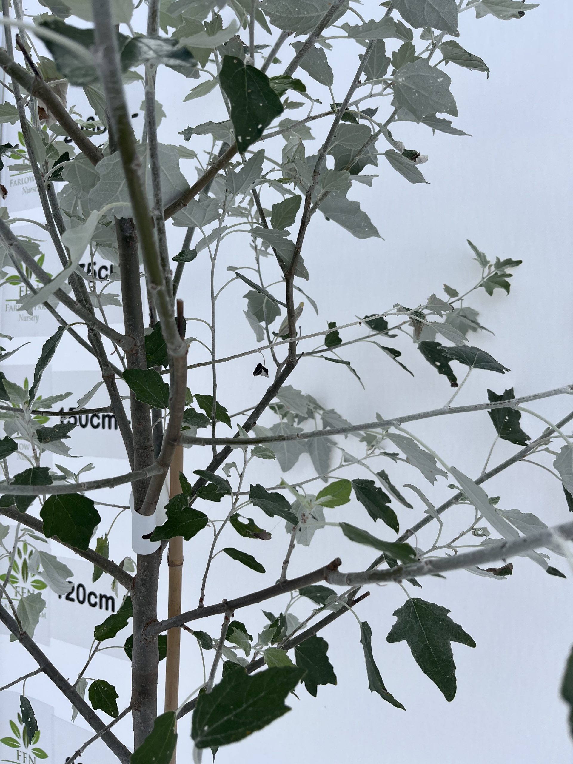 A spreading, deciduous tree with a broad crown, suckering freely. Rounded leaves are deeply-lobed, dark green on top and white and downy underneath. Young shoots and leaves are completely white and hairy; yellow autumn colour. In spring, male catkins are red and female, green.