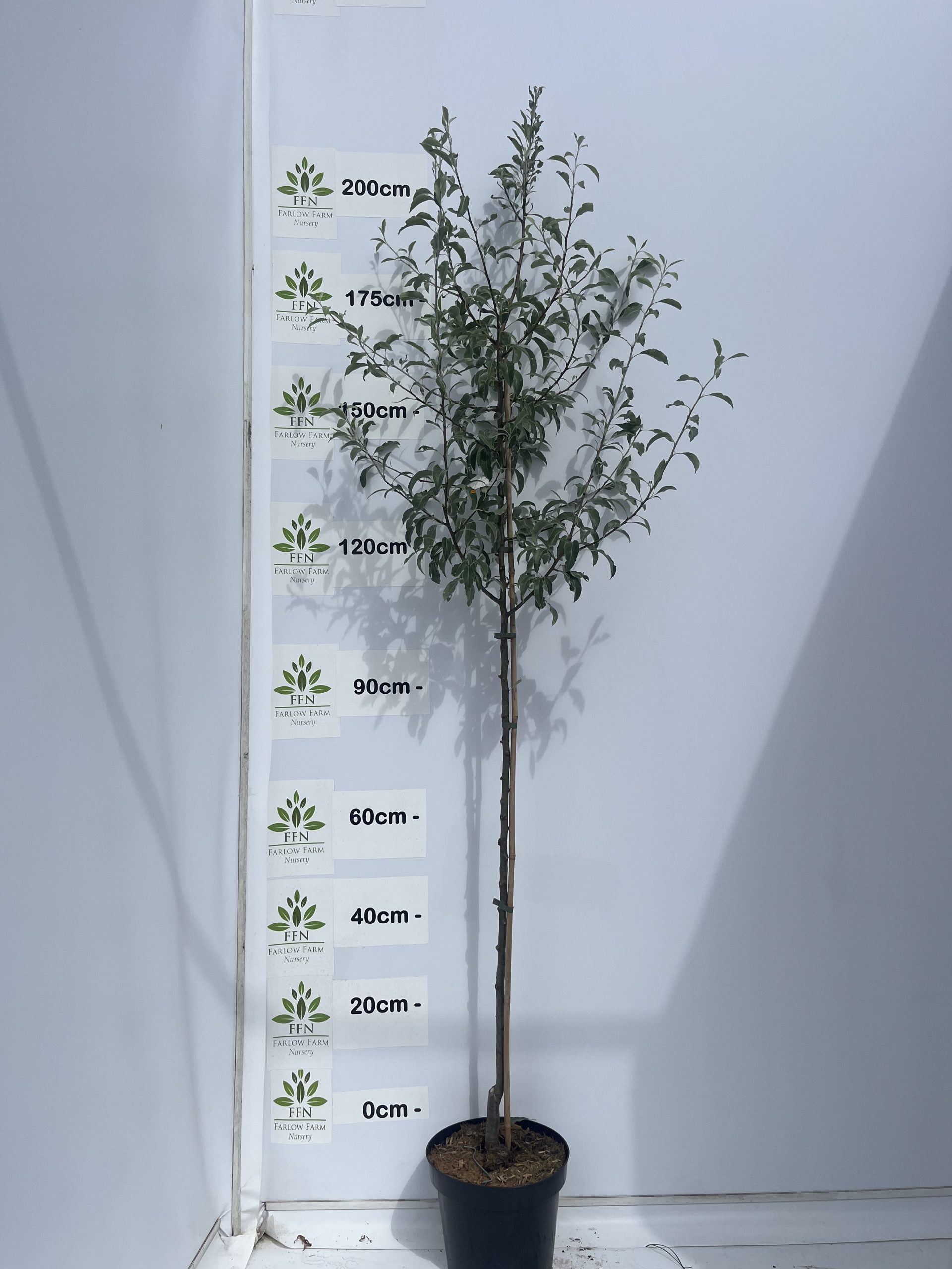 A small, spiny tree to about 5m with downy young shoots and narrow, silvery-green leaves covered in downy hairs, especially on the undersides. In spring, bears clusters of large white blossom, 3cm across, with conspicuous red anthers, followed in autumn by rounded, yellow-green, ornamental fruit up to 2cm across.
