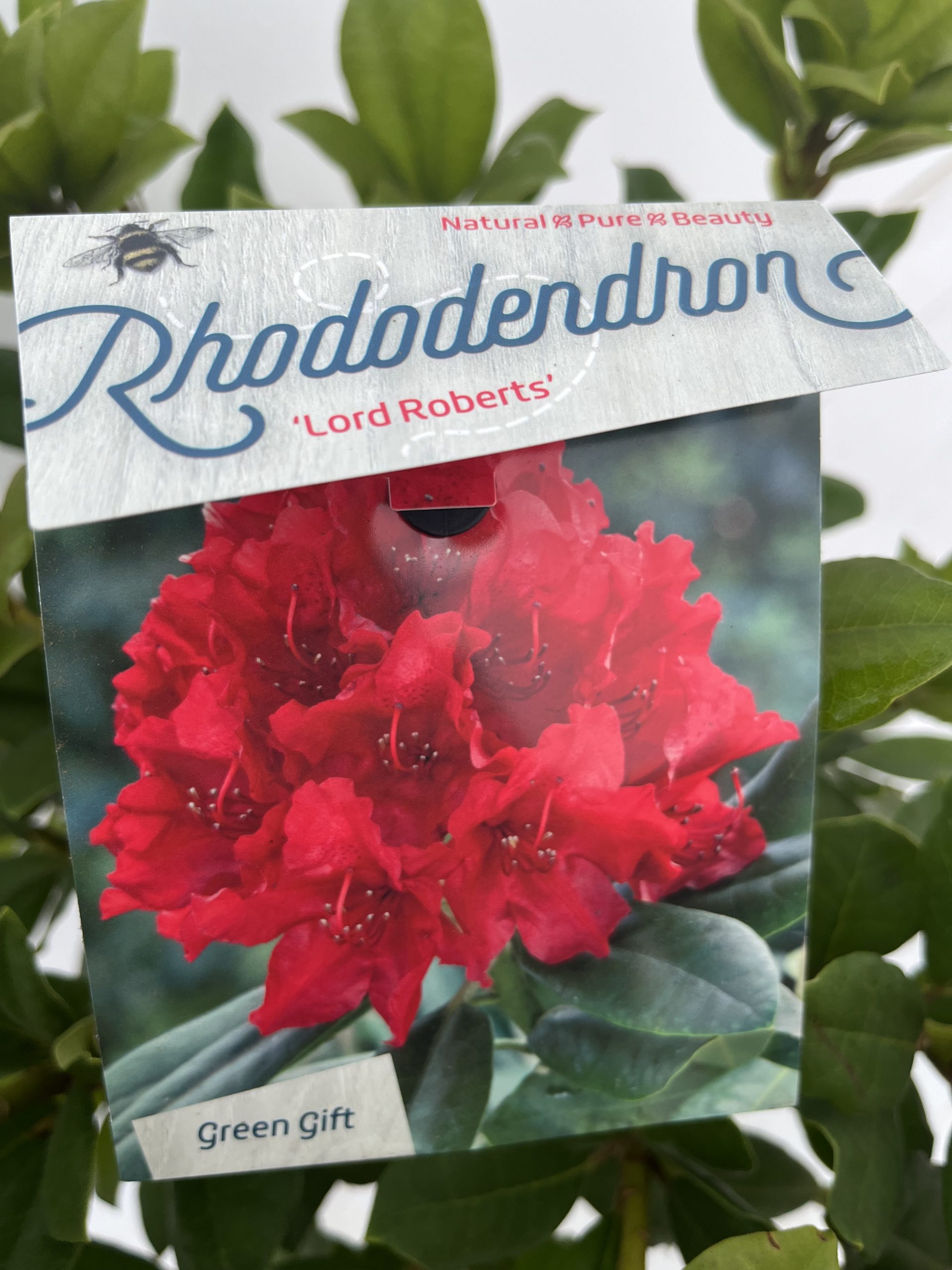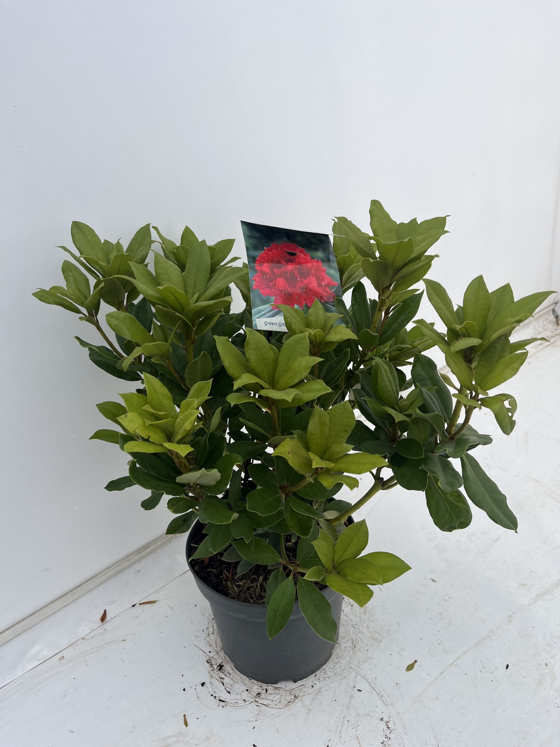 A large, upright evergreen shrub with rounded trusses of deep crimson, funnel-shaped flowers, marked with black in the throat, opening late spring to early summer.