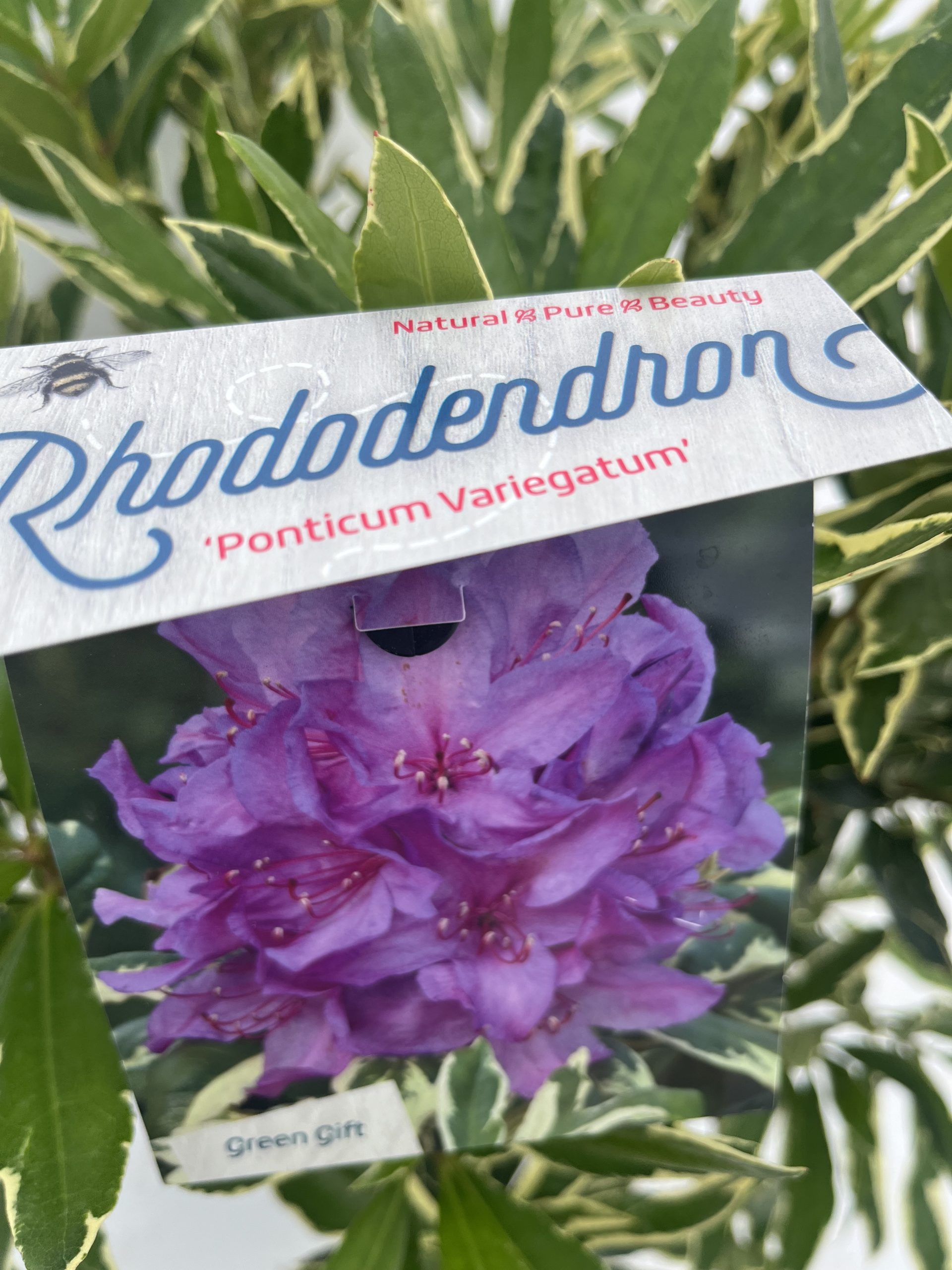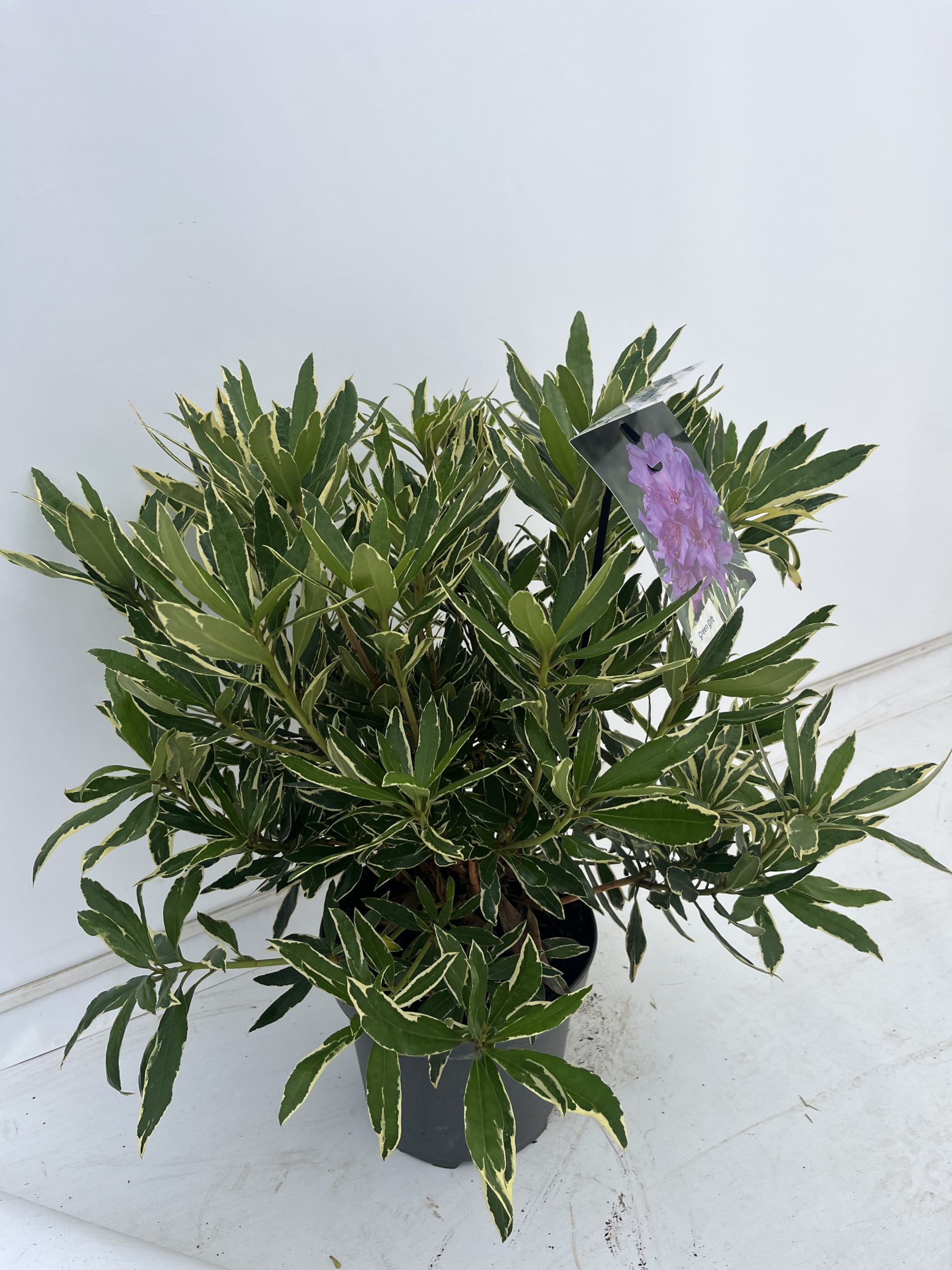 A densely branching, evergreen shrub, with dark green, leathery leaves with a creamy white margin and terminal trusses of mauve, funnel-shaped flowers in spring.
