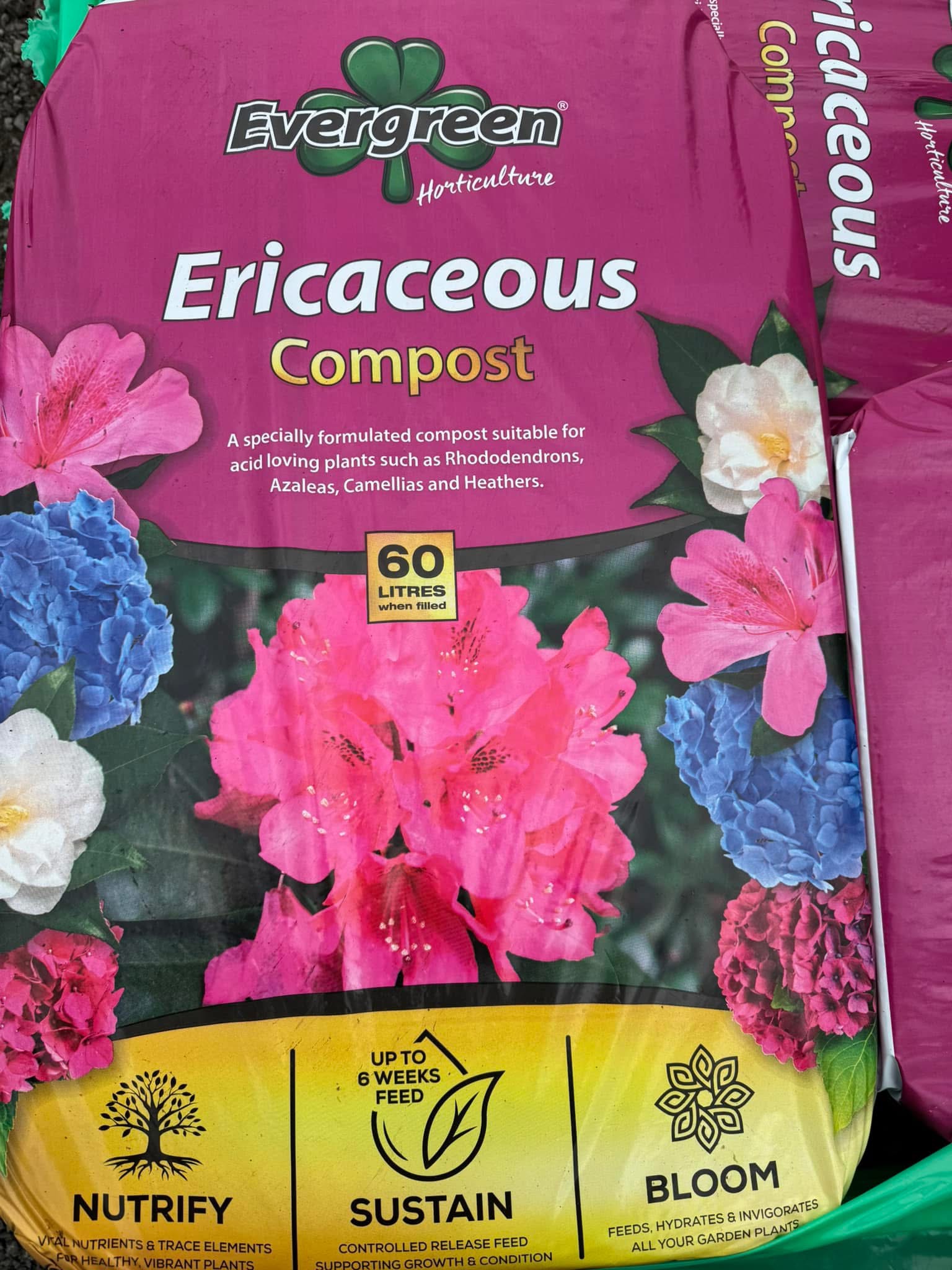 60 Litre bag of “Evergreen” Ericaceous compost, suitable for lime hating plants such as Rhododendrons, Azaleas, Camellias and Heathers, contains up to 6 weeks feed.